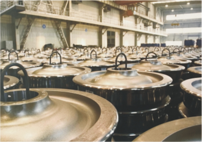 車輪成形在100MN框架式油壓機上完成,實現(xiàn)輪轂、輻板及輪輞的金屬第二次分配。