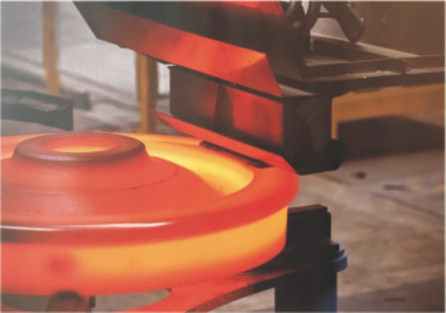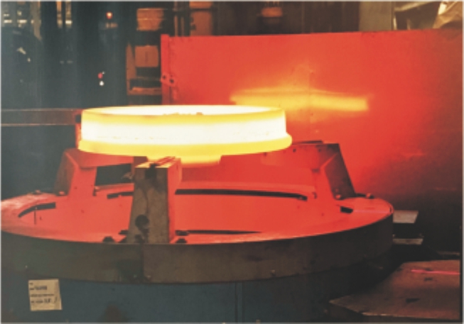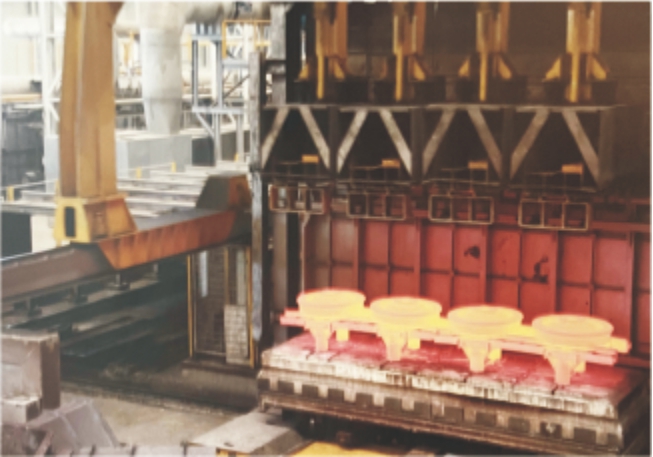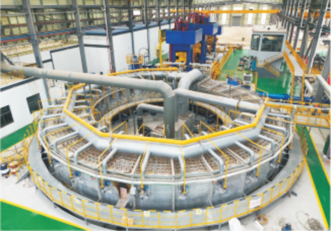 直徑24M環(huán)形加熱爐滿載布料達360件,利用天然氣加熱,通過脈沖比例控溫實現(xiàn)溫度均勻性±10℃,出爐溫度1250℃,具備每小時出料80件的加熱能力。